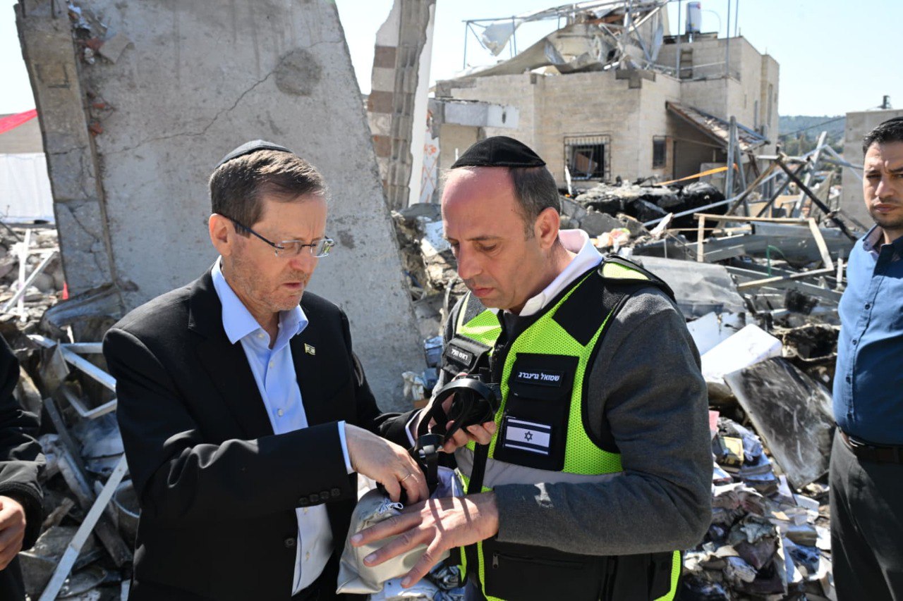 «Это одна из первых синагог в Бейт-Шемеше. Ракета полностью уничтожила синагогу и вошла в убежище, потому что это было прямое попадание ракеты весом в полтонны. Здесь были убиты дети. Девять невинных душ были потеряны. Всю ночь команды мэра собирали их останки и фрагменты. Мы молимся за погибших, мы молимся вместе с семьями и надеемся, что они найдут утешение», — заявил президент.