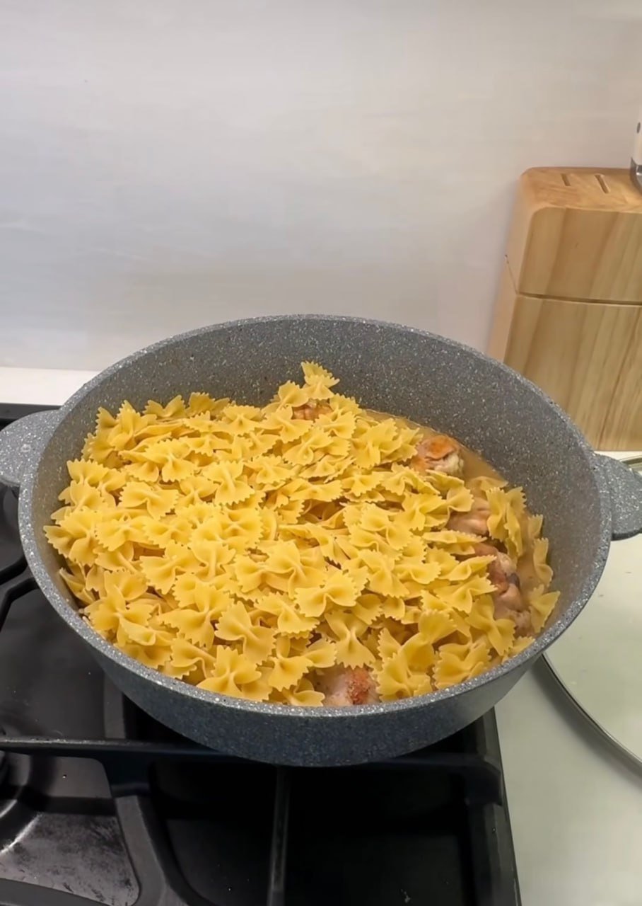 Добавить сухую пасту и влить ещё 400–500 г воды, чтобы они были почти покрыты жидкостью. Перемешать, накрыть крышкой и готовить 12–15 минут, периодически помешивая. При необходимости добавить немного горячей воды. Выключить огонь и оставить под закрытой крышкой на 5 минут.