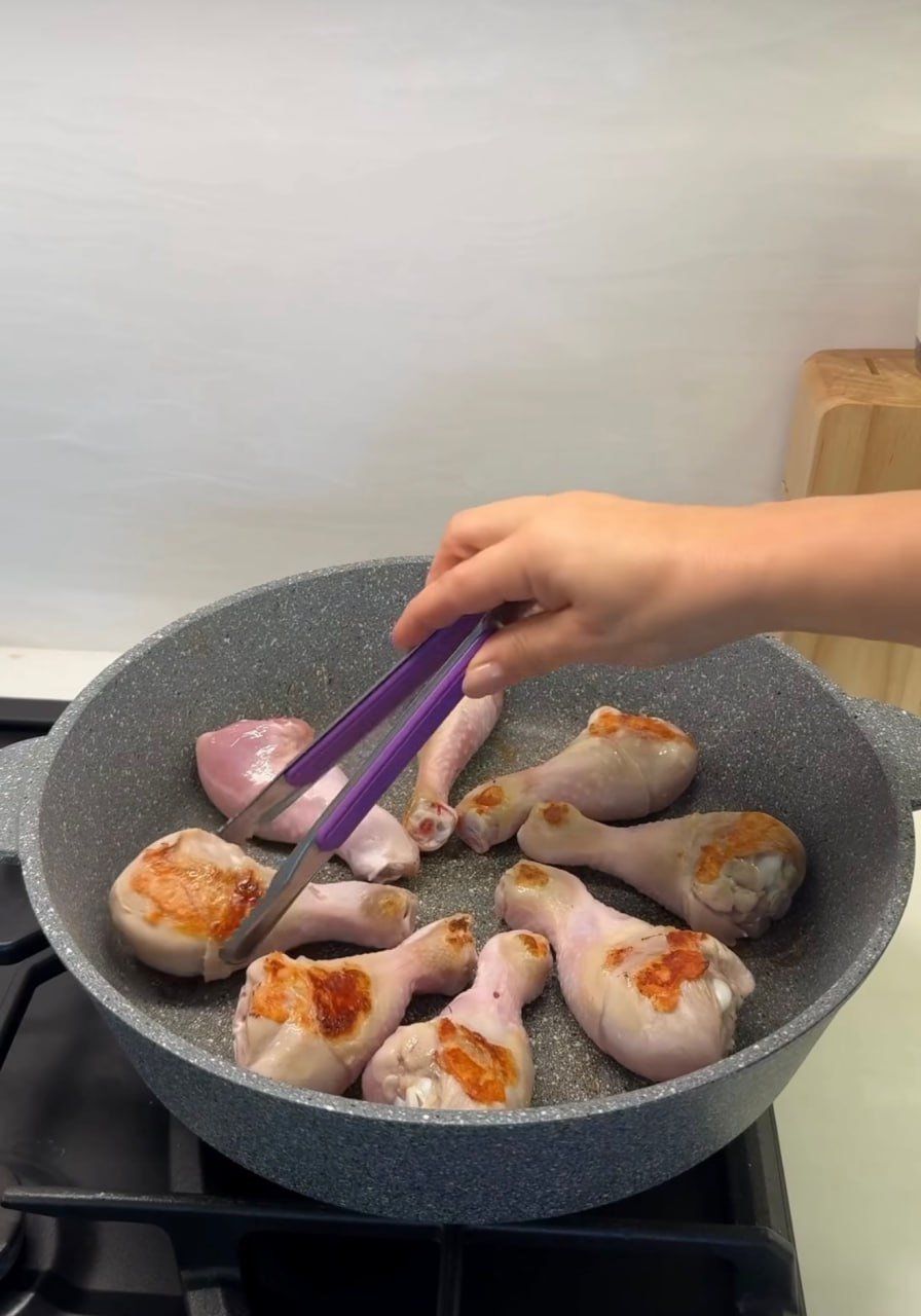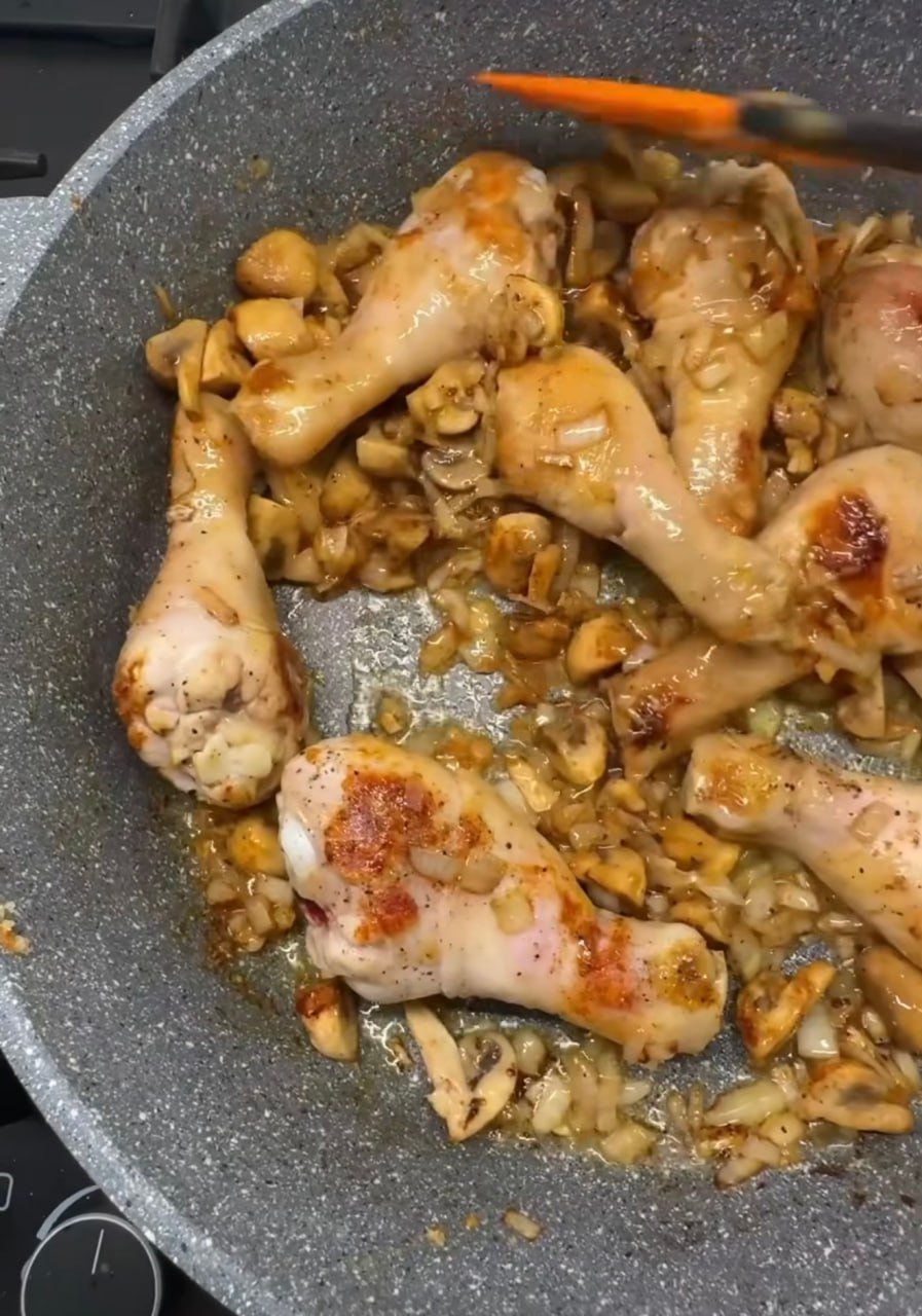 Куриные ножки обсушить. Лук нарезать мелким кубиком, чеснок измельчить, грибы нарезать пластинами. Разогреть сухую сковороду на среднем огне. Выложить куриные ножки и обжаривать 5–7 минут до румяной корочки. Перевернуть и жарить ещё 5 минут. Добавить растительное масло и готовить ещё 3–4 минуты. Добавить лук, обжаривать 3–4 минуты до мягкости. Добавить чеснок и готовить ещё 30 секунд. Всыпать грибы и обжаривать 5–7 минут, пока не испарится лишняя влага. Влить 400 г воды, добавить соль и перец. Накрыть крышкой и тушить 20–25 минут на среднем огне.