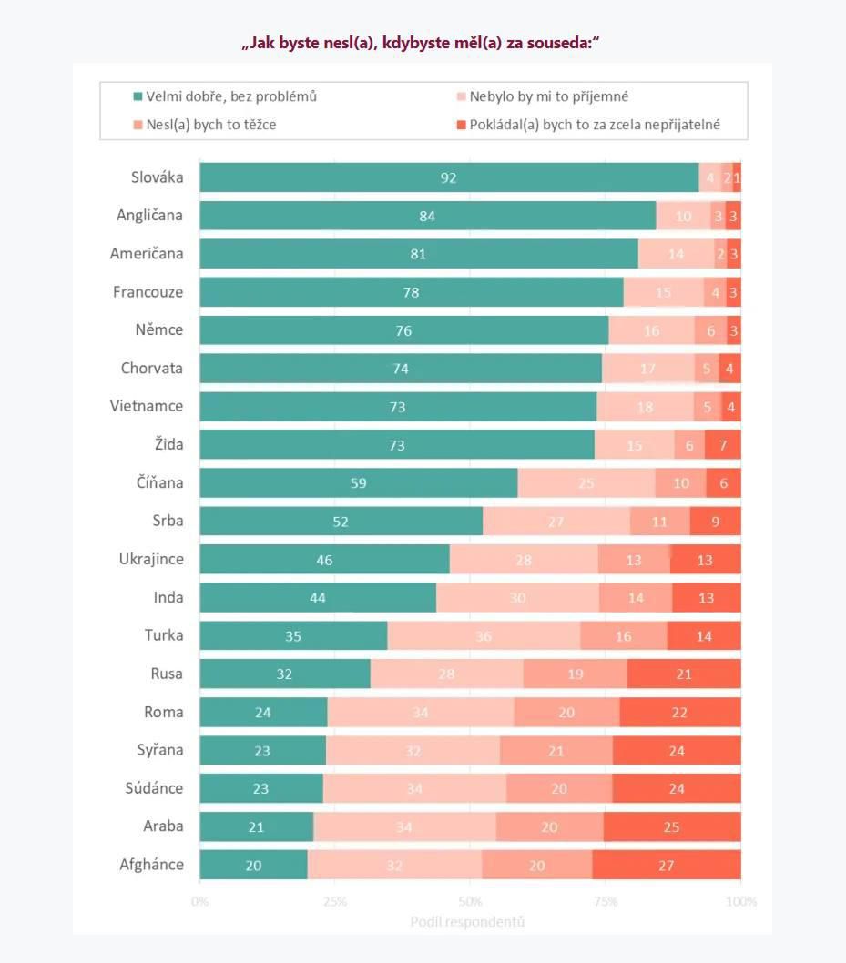 Наиболее желанными соседями для чехов остаются словаки — около 92–93% опрошенных заявили, что не имели бы никаких проблем жить рядом с ними. Социологи объясняют это исторической и культурной близостью двух народов, а также длительным периодом существования в одной стране.